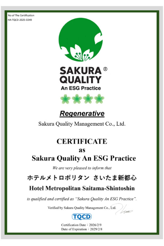 この度、SDGsを実践する宿泊施設の国際認証「Sakura Quality An ESG Practice(通称:サクラクオリティグリーン)」の